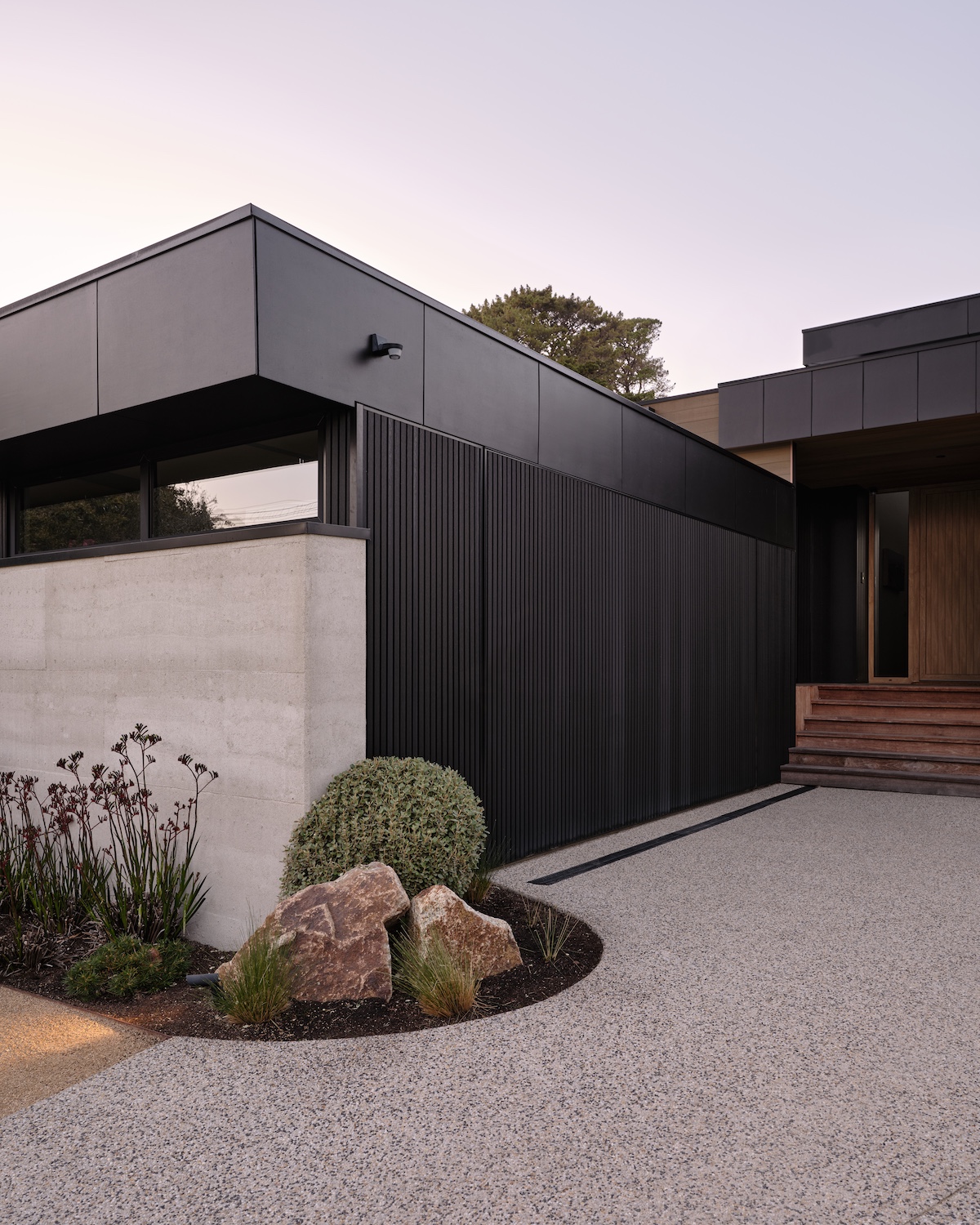A plant palette featuring a blend of natives and exotics softens and offset the modern architecture, designed by Mornington Peninsula-based custom home builder Alternate Vision. Organic bluestone steppers, natural stone boulders and corten steel complete the picture. Smart Landscapes is proud to maintain this beloved garden on an ongoing basis for our clients.